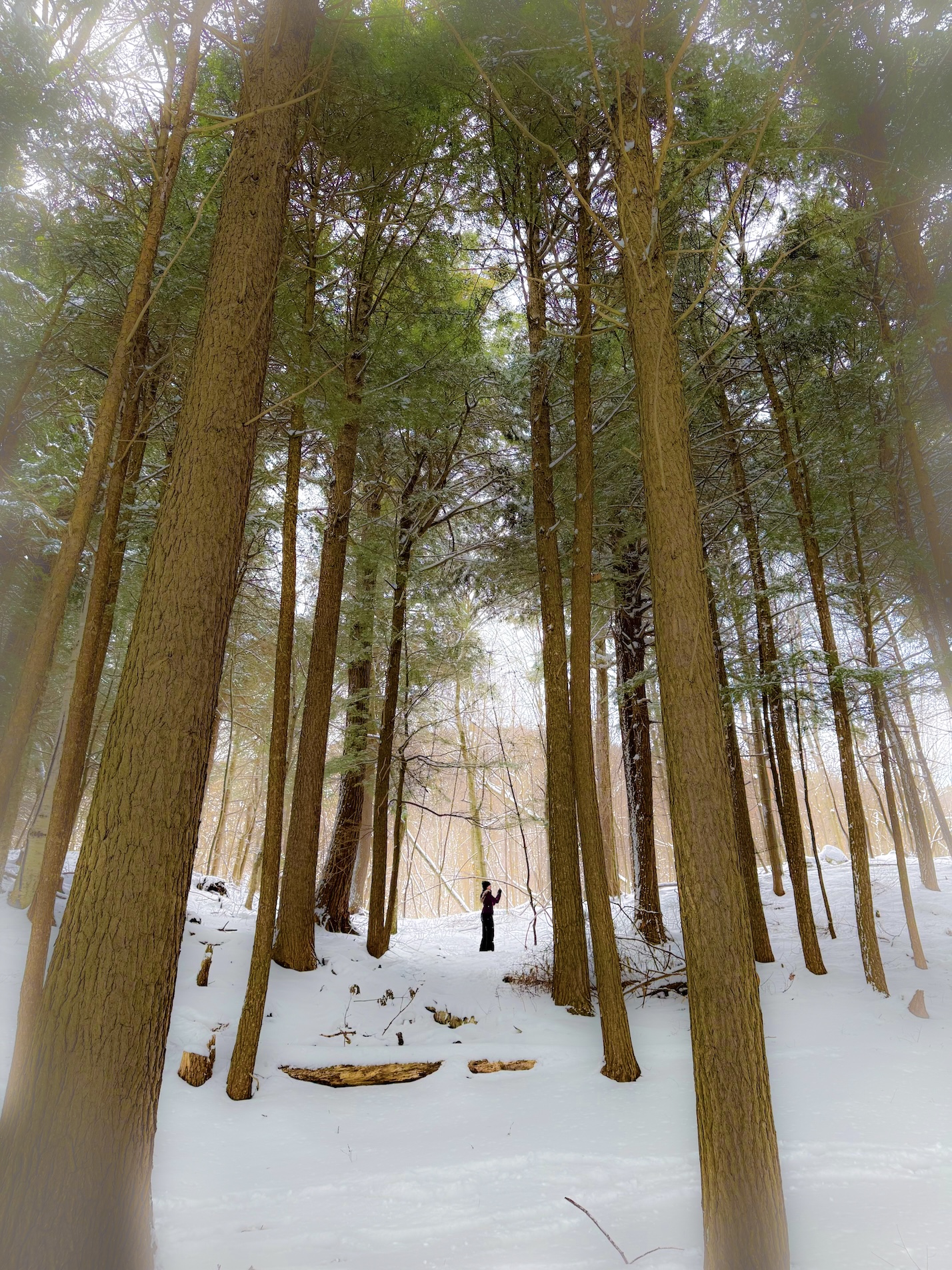 The snow-powdered bridge marks the threshold to the forest. Underneath, water rushes past massive boulders of ice, in search of available crevices. As I enter the path lined by snowy pines, my footsteps soften and the clamor of the highway dissipates.